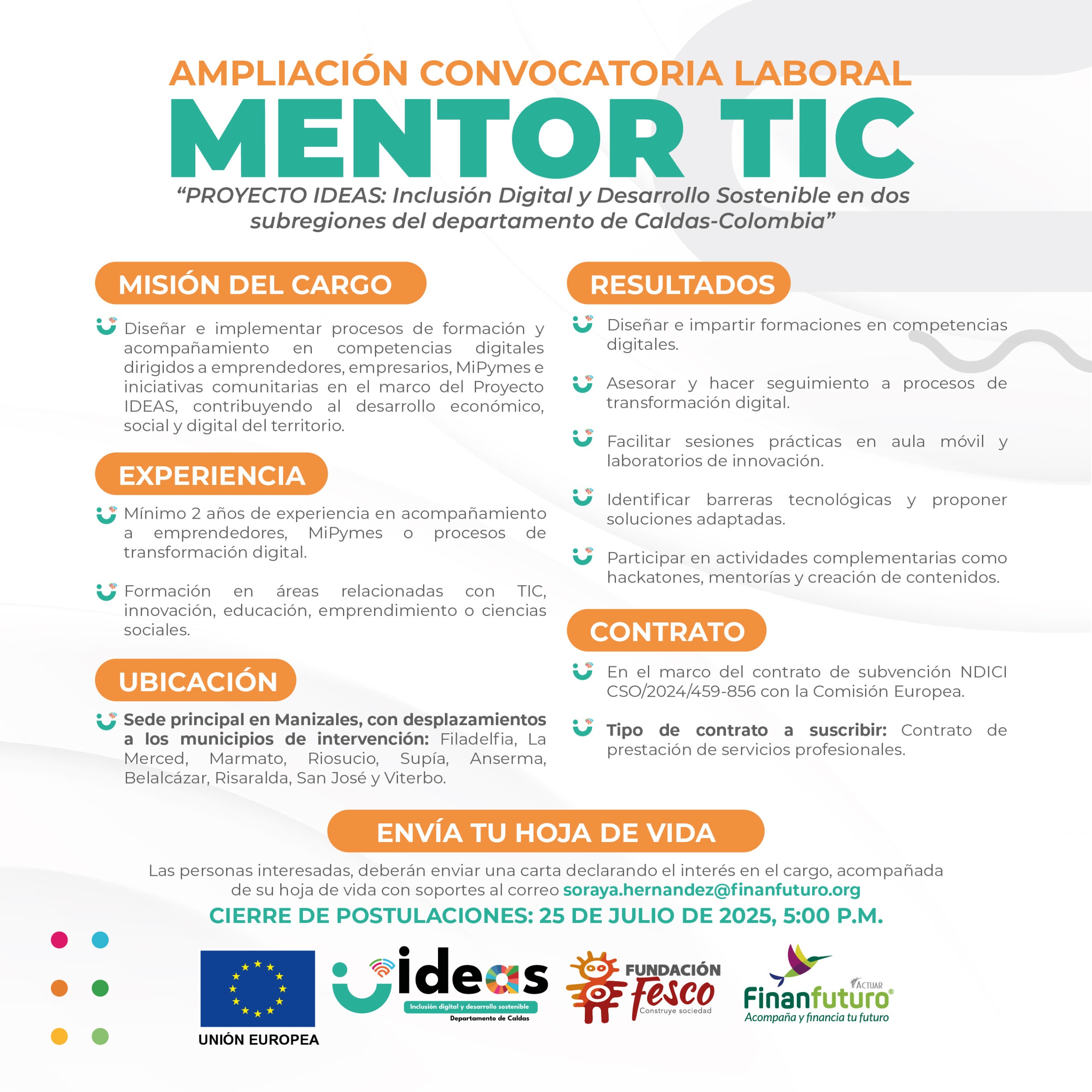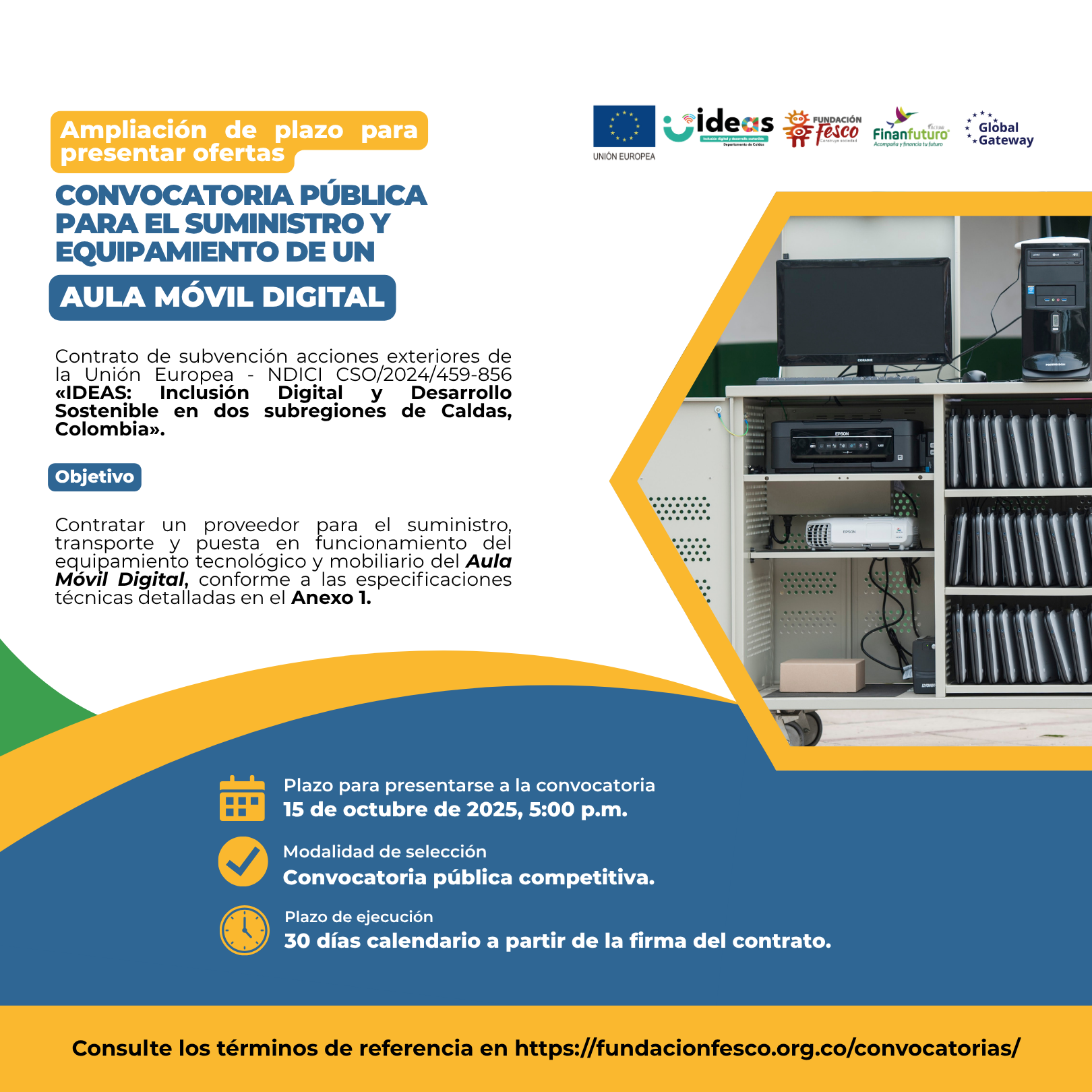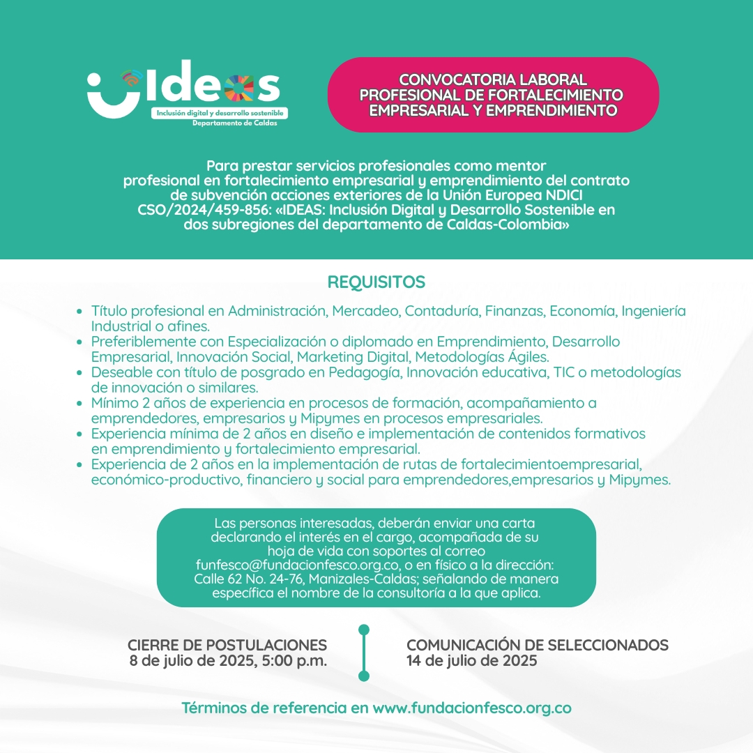 INICIO IDEAS COMPONENTES MULTIMEDIA CONVOCATORIAS CONVOCATORIAS IDEAS - Departamento de Caldas, Colombia ; Inscripción a programas de formación Inscríbete Inscripciones cerradas Inscripciones cerradas Convocatoria pública cerrada Términos de referencia Anexo - Declaración jurada Preguntas frecuentes CONVOCATORIA FINALIZADA Terminos y condiciones Se extiende el plazo para la notificación deseleccionados hasta el 1 de agosto CONVOCATORIA FINALIZADA Terminos y condiciones Se extiende el plazo para la notificación deseleccionados hasta el 21 de julio CONVOCATORIA FINALIZADA Terminos y condiciones CONVOCATORIA FINALIZADA Se extiende plazo para la presentación depostulaciones hasta el 28 de enero Terminos y condiciones CONVOCATORIA FINALIZADA Se extiende plazo para la comunicación de seleccionados hasta el 28 de enero del 2025 Terminos y condiciones SeguirSeguirSeguir Contáctanos para más información: funfesco@fundacionfesco.org.co