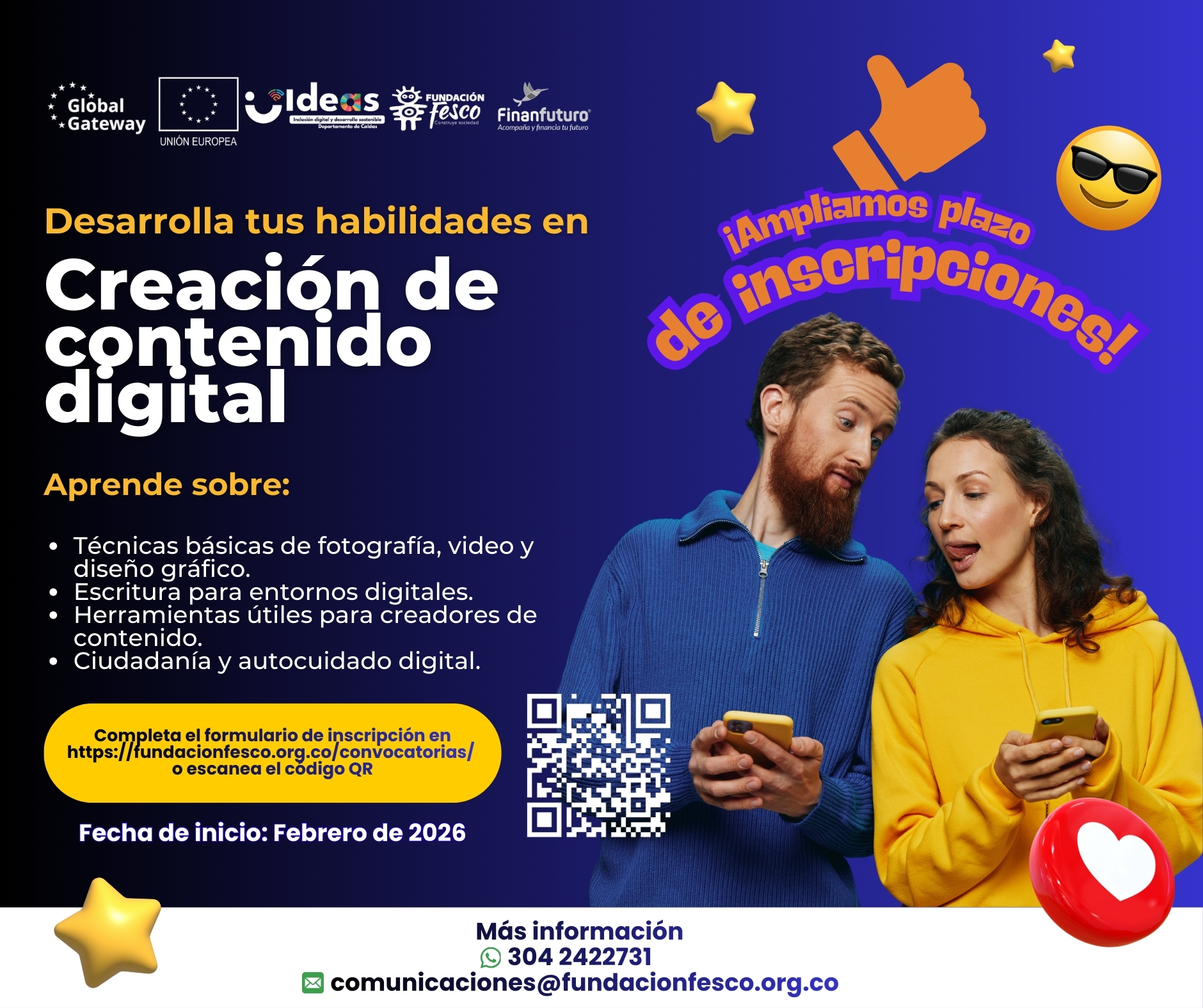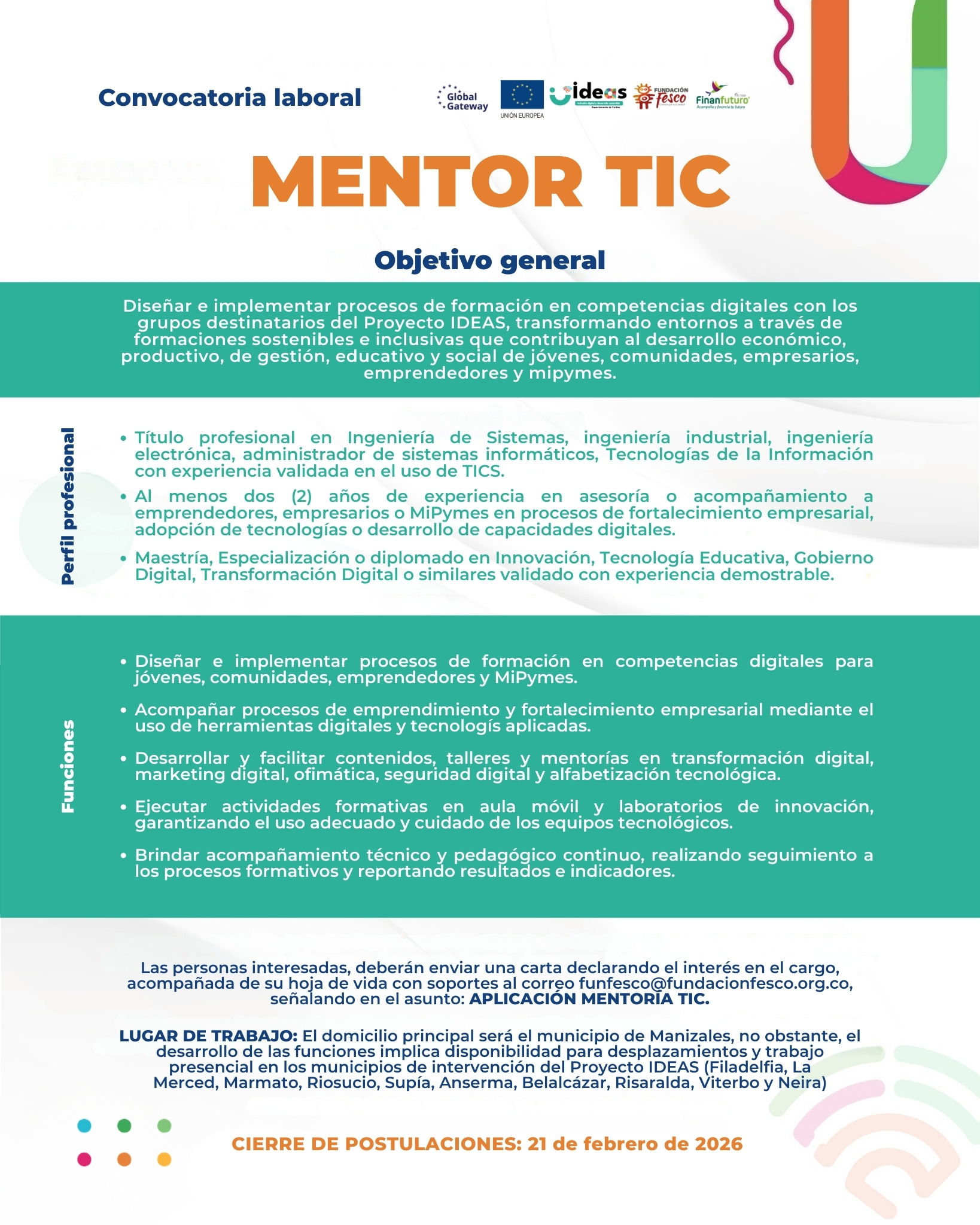 INICIO IDEAS COMPONENTES MULTIMEDIA CONVOCATORIAS CONVOCATORIAS IDEAS - Departamento de Caldas, Colombia ; CONVOCATORIA ABIERTA Términos de referencia CONVOCATORIA CERRADA Términos de referencia Inscripción a programas de formación Inscríbete Inscripciones cerradas Inscripciones cerradas Convocatoria pública cerrada Términos de referencia Anexo - Declaración jurada Preguntas frecuentes CONVOCATORIA FINALIZADA Terminos y condiciones Se extiende el plazo para la notificación deseleccionados hasta el 1 de agosto CONVOCATORIA FINALIZADA Terminos y condiciones Se extiende el plazo para la notificación deseleccionados hasta el 21 de julio CONVOCATORIA FINALIZADA Terminos y condiciones CONVOCATORIA FINALIZADA Se extiende plazo para la presentación depostulaciones hasta el 28 de enero Terminos y condiciones CONVOCATORIA FINALIZADA Se extiende plazo para la comunicación de seleccionados hasta el 28 de enero del 2025 Terminos y condiciones SeguirSeguirSeguir Contáctanos para más información: funfesco@fundacionfesco.org.co